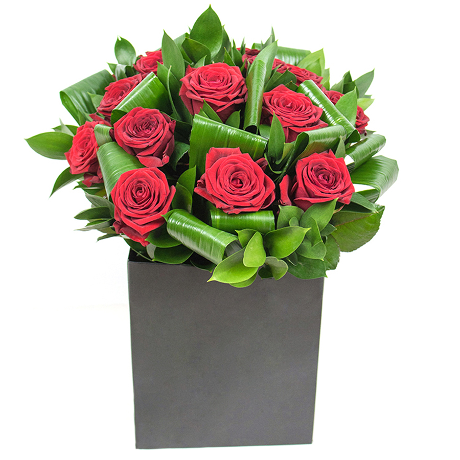 Add a touch of elegance to your home with our chic bouquet featuring red roses, vibrant aspidistra leaves, and lush ruscus. This beautifully designed arrangement offers a perfect blend of color and texture.